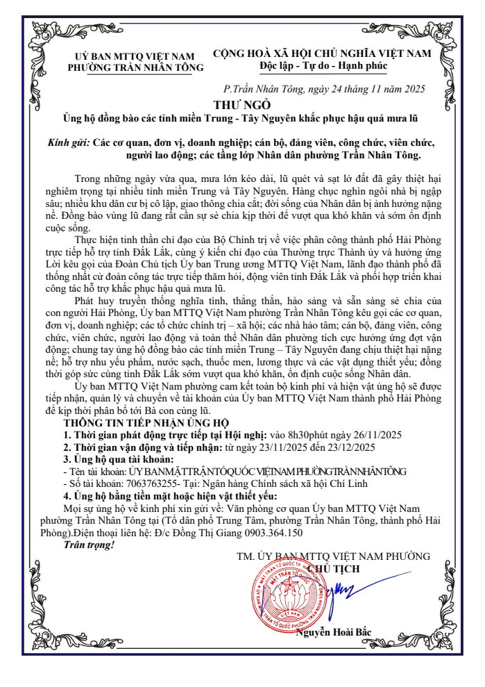 Ủy ban Mặt trận tổ quốc Việt Nam phường Trần Nhân Tông kêu gọi ủng hộ đồng bào các tỉnh miền Trung - Tây Nguyên khắc phục hậu quả mưa lũ