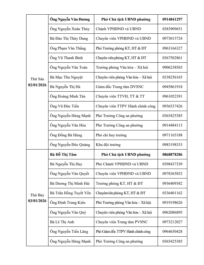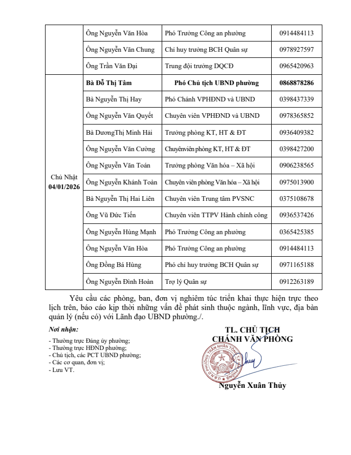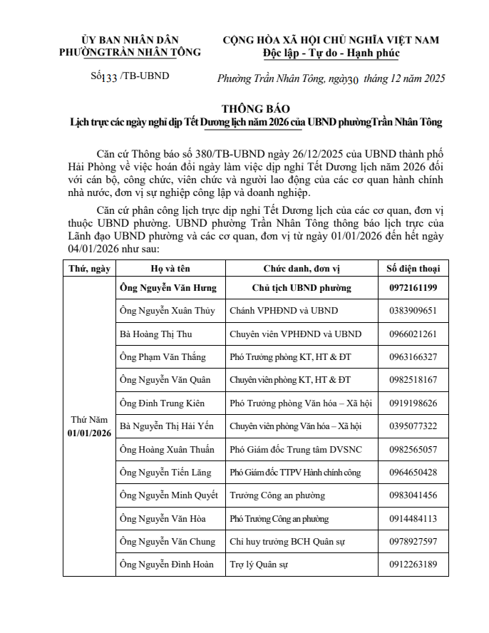 Căn cứ phân công lịch trực dịp nghỉ Tết Dương lịch của các cơ quan, đơn vị thuộc UBND phường. UBND phường Trần Nhân Tông thông báo lịch trực của Lãnh đạo UBND phường và các cơ quan, đơn vị từ ngày 01/01/2026 đến hết ngày 04/01/2026 như sau: