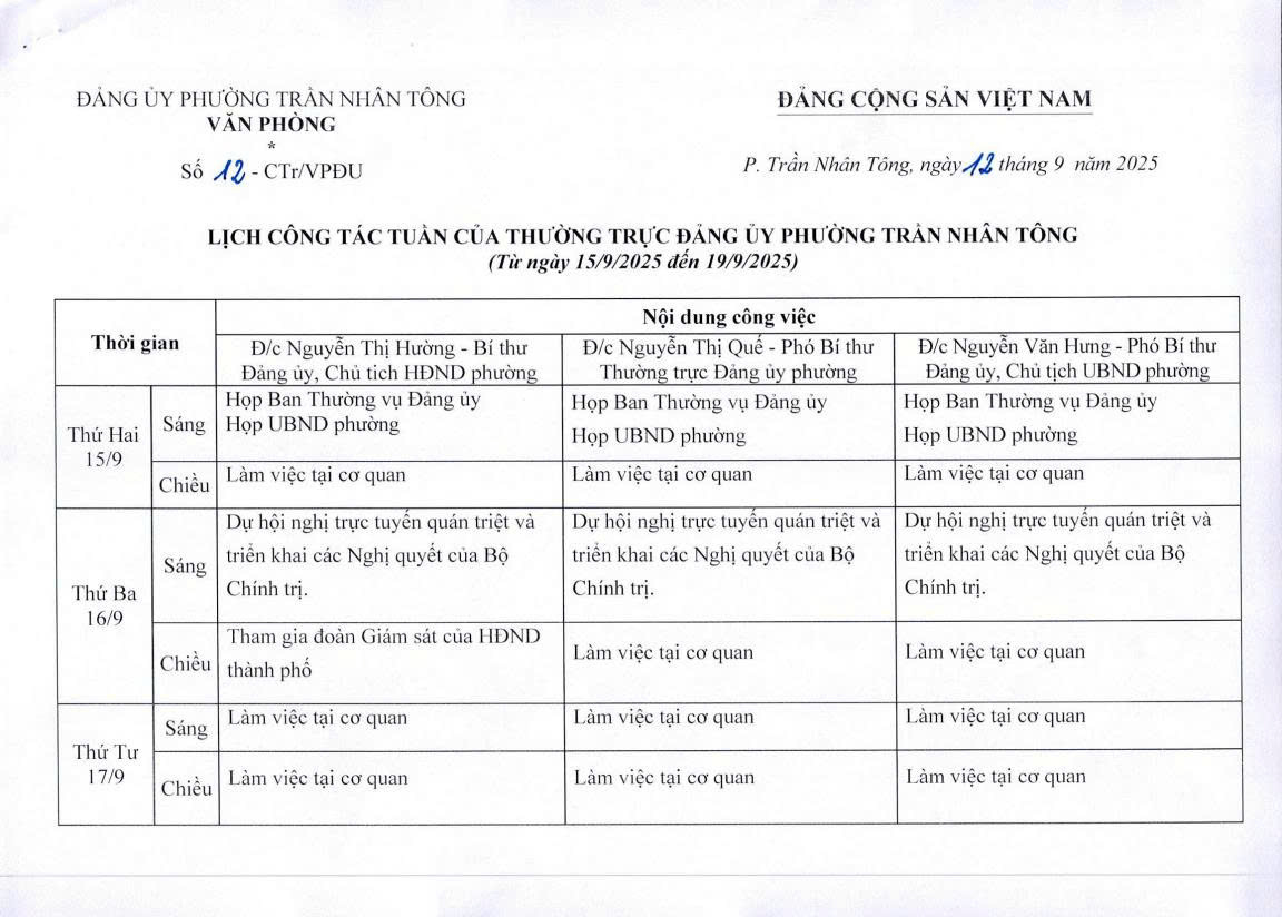 Lịch công tác tuần của Thường trực Đảng ủy phường Trần Nhân Tông từ ngày 15/9 đến 19/9/2025.