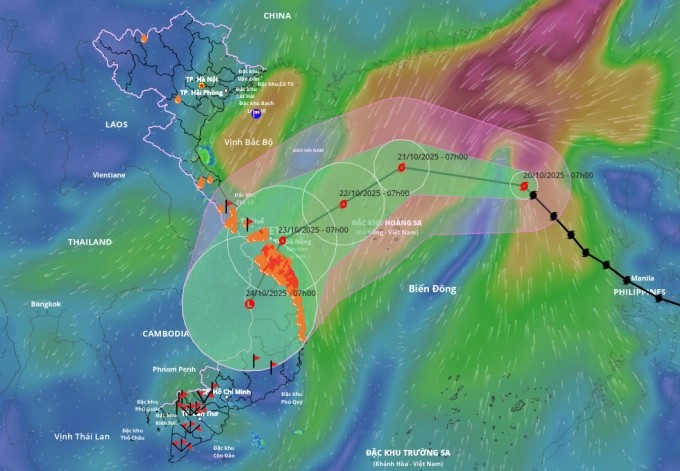 - 13h 22/10: Di chuyển theo hướng Tây Nam 5–10 km/h, trên vùng biển Tây Bắc Hoàng Sa; mạnh cấp 10, giật cấp 13. Cấp độ rủi ro thiên tai: Cấp 3 (Bắc Biển Đông, bao gồm đặc khu Hoàng Sa).