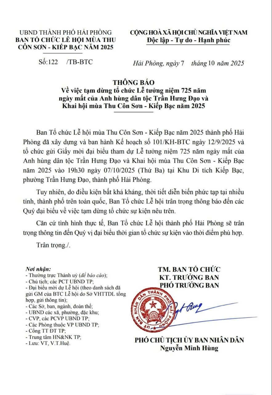 Thông báo tạm dừng Lễ Khai hội mùa thu Côn Sơn - Kiếp Bạc năm 2025