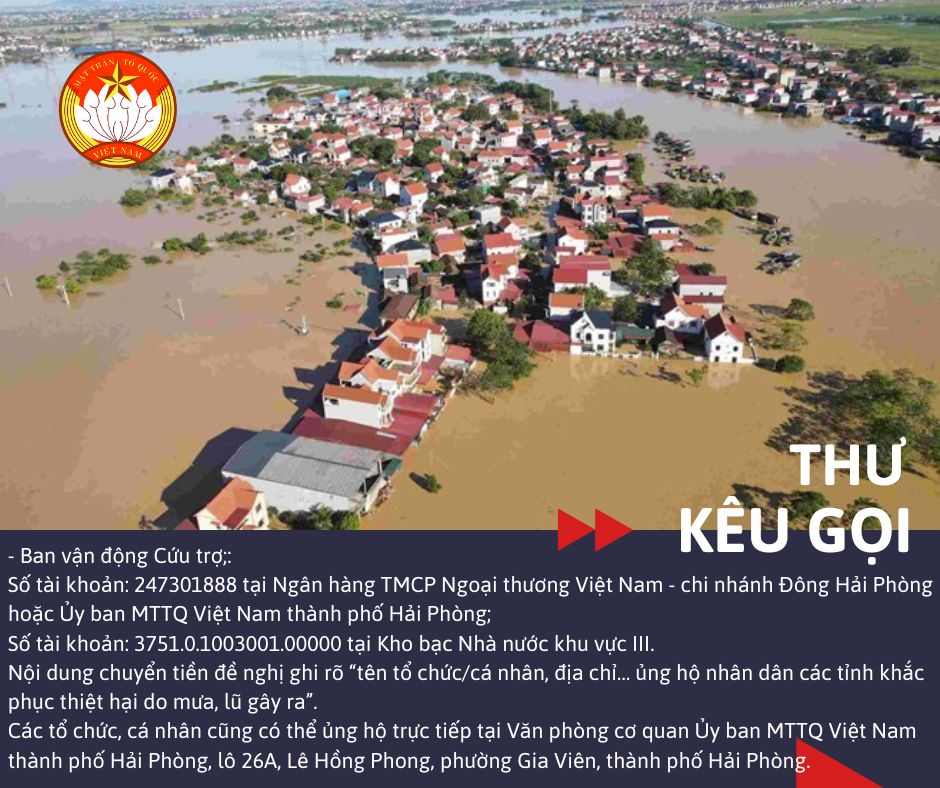Hưởng ứng lời kêu gọi của Đoàn Chủ tịch Ủy ban Trung ương MTTQ Việt Nam, được sự đồng ý của Thường trực Thành ủy, Ủy ban MTTQ Việt Nam thành phố Hải Phòng kêu gọi các cơ quan, tổ chức, đơn vị, doanh nghiệp, nhà hảo tâm, các tổ chức tôn giáo, tổ chức chính trị - xã hội, tổ chức xã hội, cán bộ, công chức, người lao động và các tầng lớp nhân dân phát huy truyền thống đoàn kết của dân tộc, bằng những việc làm cụ thể, nhằm chung tay sẻ chia, hỗ trợ động viên về vật chất và tinh thần giúp nhân dân các tỉnh bạn nhanh chóng khắc phục thiệt hại, khôi phục sản xuất, kinh doanh, sớm ổn định cuộc sống.