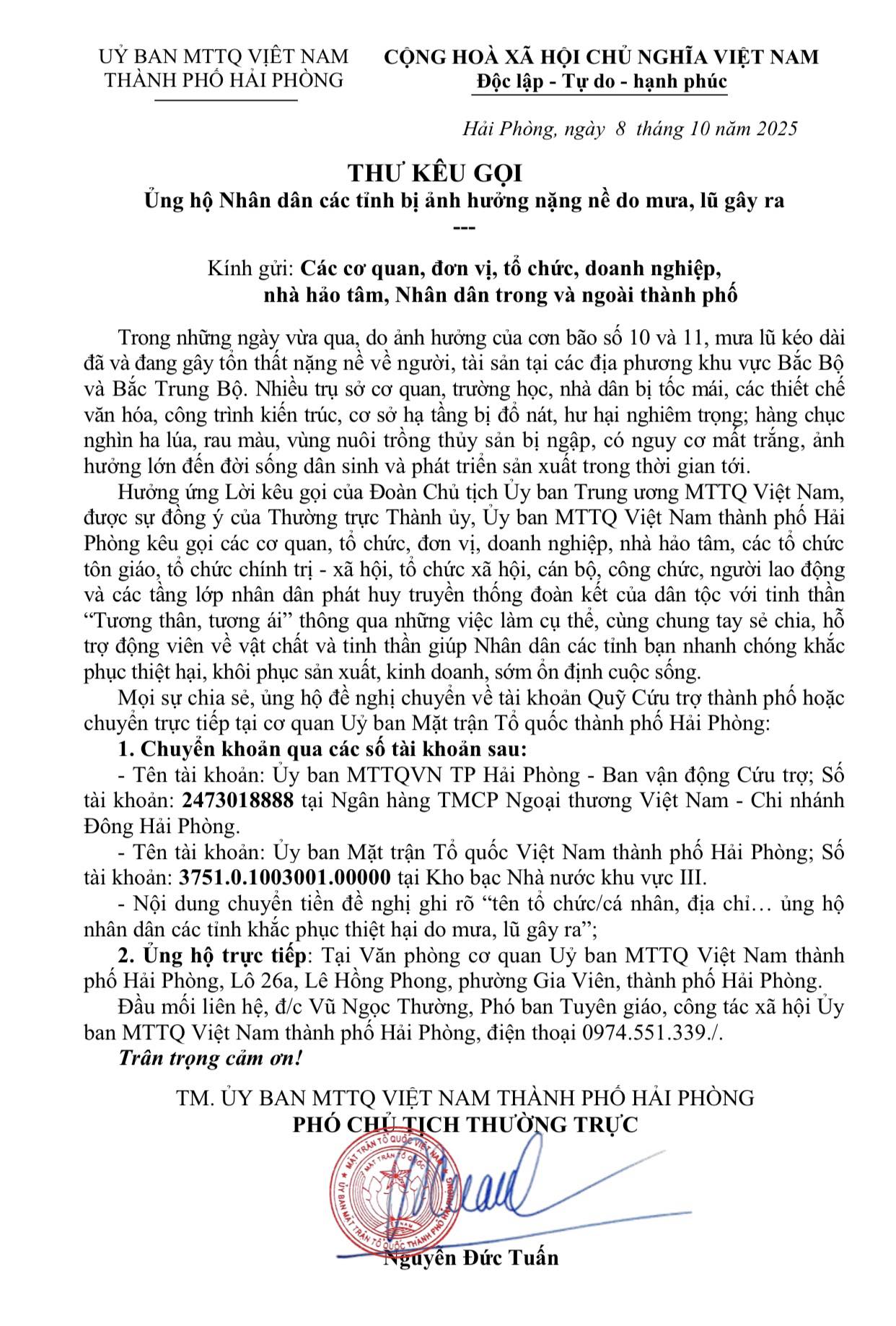 Mọi sự chia sẻ, ủng hộ đề nghị chuyển về tài khoản Quỹ Cứu trợ thành phố với tên tài khoản: Ủy ban MTTQ Việt Nam thành phố Hải Phòng - Ban vận động Cứu trợ; số tài khoản: 2473018888 tại Ngân hàng TMCP Ngoại thương Việt Nam - chi nhánh Đông Hải Phòng hoặc Ủy ban MTTQ Việt Nam thành phố Hải Phòng; số tài khoản: 3751.0.1003001.00000 tại Kho bạc Nhà nước khu vực III. Nội dung chuyển tiền đề nghị ghi rõ “tên tổ chức/cá nhân, địa chỉ… ủng hộ nhân dân các tỉnh khắc phục thiệt hại do mưa, lũ gây ra”.